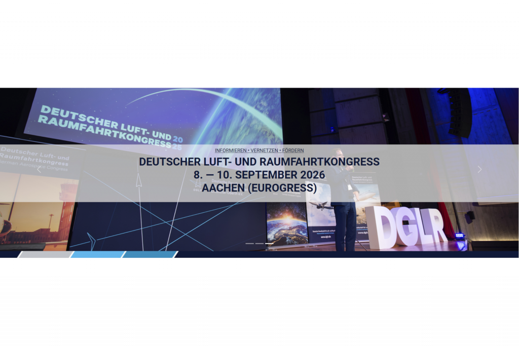 - Save the Date: 75. Deutscher Luft- und Raumfahrtkongress 2026 (DLRK)Der Deutsche Luft- und Raumfahrtkongress (DLRK) ist vom 8. – 10. September 2026 in Aachen zu Gast und ist mit rund 1.000 Teilnehmenden, mehr als 450 Fachvorträgen und Postern in über 100 Sitzungen, Plenarvorträgen & Diskussionsrunden zu aktuellen technologischen, wirtschaftlichen und politischen Fragestellungen eines der größten europäischen wissenschaftlich-technischen Netzwerktreffen der… Read more »