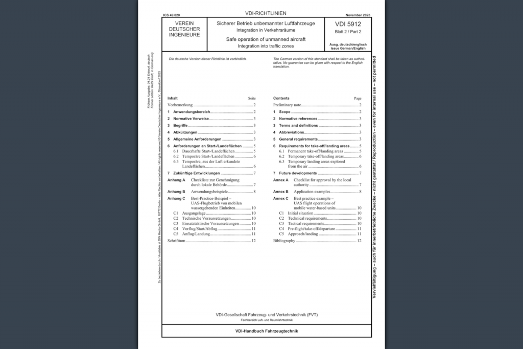 - Neue Drohnen-Richtlinie VDI 5912 Blatt 2 über temporäre und flexible Start- und Landeflächen für den UAS-Betrieb veröffentlichtMit der zunehmenden Professionalisierung unbemannter Luftfahrtsysteme (UAS) wächst auch der Bedarf an klaren, praxisnahen Vorgaben für deren sicheren Betrieb. Die neue VDI-Richtlinie adressiert genau diesen Bedarf und definiert Anforderungen an die Bewertung, Ausgestaltung und Genehmigung temporärer bzw. flexibler Start- und Landeflächen. Der Anwendungsbereich umfasst insbesondere VTOL- und STOL-Drohnenklassen mit einer… Read more »